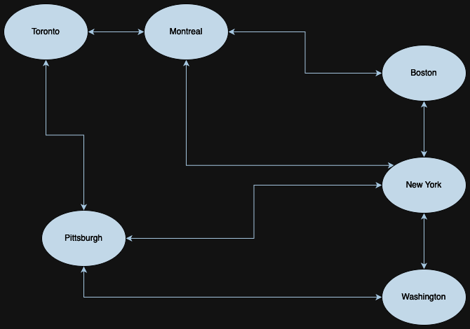With all that being said, I’ll begin with a stab at the most enticing bit of the data model, the map. Here is a snippet of the relationships between five cities on the original North American map.