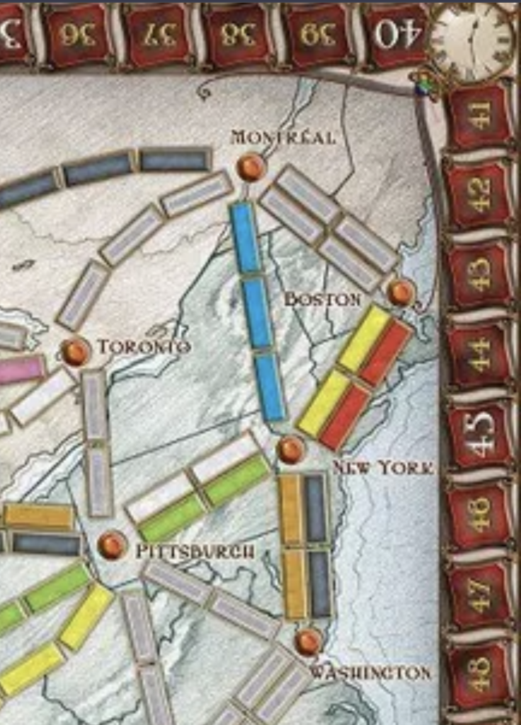 This is a good start, but it doesn’t tell the full story. Each of these cities are actually connected by different routes, requiring different color cards for payment. Here’s a view of the actual board: